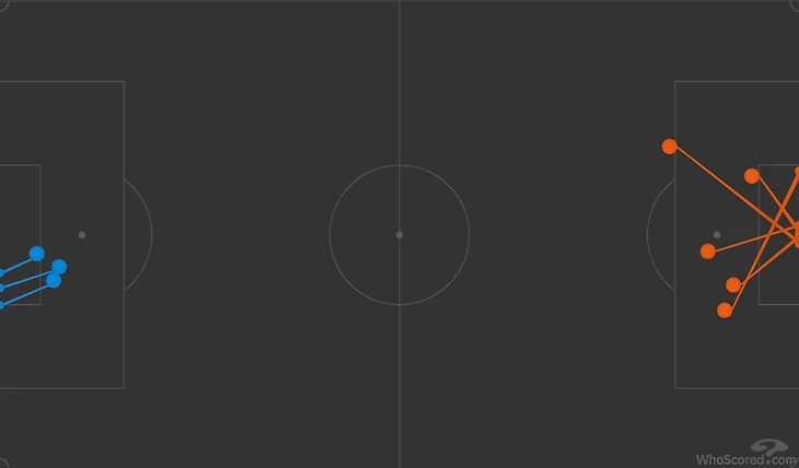 Так выглядит карта ударов из штрафной у команды, которой надо отыгрываться и висеть на чужих воротах во втором тайме (спартаковские попытки – оранжевые).