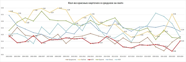 Видно, что на том же интервале с 2002/2003 по 2023/2024 сезон лидером остается Ла Лига с средним значением в 0,3 красных карточек за матч, далее идет Серия А (0,27 КК), третье место делят Лига 1 и РПЛ (0,24). Самыми дисциплинированными лигами оказались Бундеслига (0,17) и АПЛ (0,14).