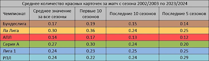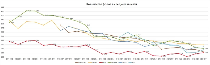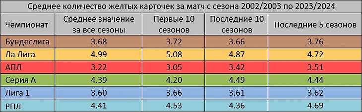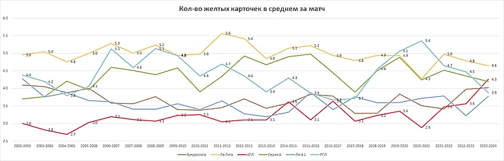 По данным с сезона 2002/2003 по 2023/2024 можно заметить, что Ла Лига стабильно является самой нарушающей лигой со средним значением в 5 желтых карточек за матч. Второе место делит Серия А и РПЛ (по 4,4 ЖК), далее идут Бундеслига (3,7) и Лига 1 (3,6). Меньше всего нарушают в АПЛ: 3,2 желтых карточек в среднем за матч.