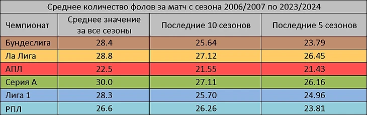 Если же сравнивать показатели за последние 10 лет (уже включая РПЛ), то можно увидеть, что на первое место выходит Ла Лига (27,12 фолов в среднем за матч), совсем чуть-чуть обгоняя Серию А (27,11), далее идет РПЛ (26,26). АПЛ все так же может похвастаться наименьшим кол-вом фолов (21,55).