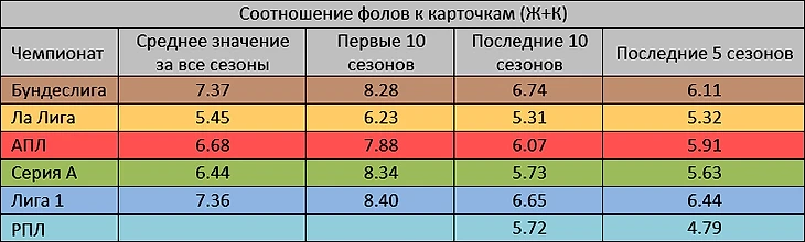 Так как не имеется полной статистики по фолам в РПЛ до 2013 года, то нашу лигу можно сравнить лишь по последним сезонам. И тут интересное наблюдение: за последние 5 сезонов РПЛ вырывается в лидеры по частоте получения карточек: даже 5 фолов в среднем не нужно для того, чтобы судья наказал за нарушение (4,79), далее идет Ла Лига (5,32). Реже всего видят перед собой карточки игроки Лиги 1 (6,44), далее идет Бундеслига (6,11) и АПЛ (5,91).