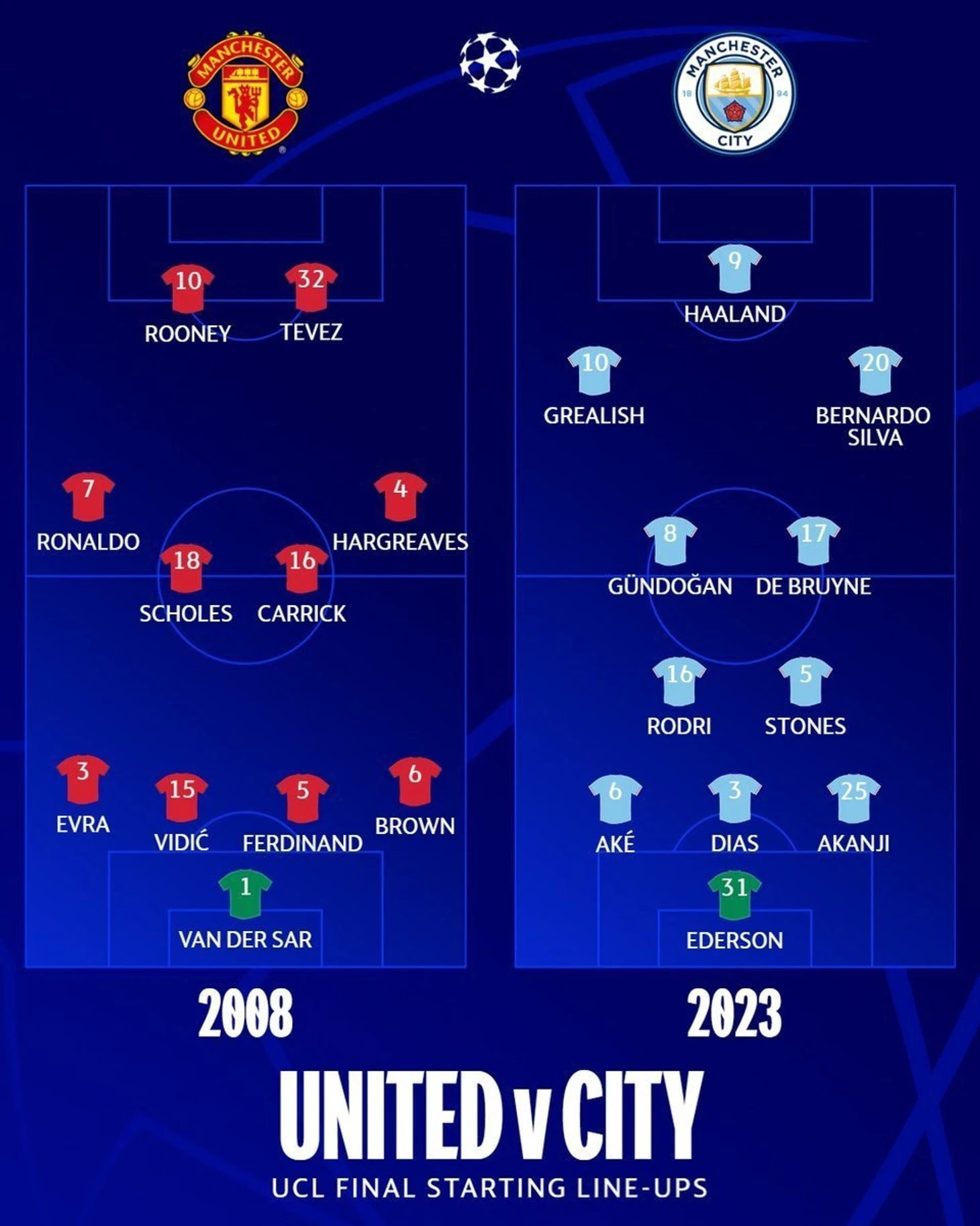 Для сравнения выбрали состав «Ман Юнайтед» на финал Лиги чемпионов сезона-2007/08 (победа над «Челси» 2:1 после серии пенальти) и команду «Ман Сити» на финальный матч главного клубного турнира Европы сезона-2022/23 (победа над «Интером» 1:0).
