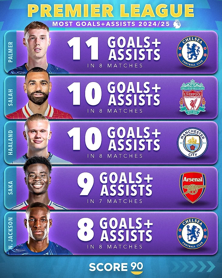 Коул Палмер возглавляет топ, хотя его «Челси» пока только на шестой строчке чемпионата.