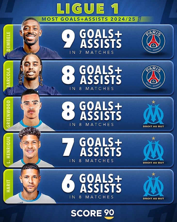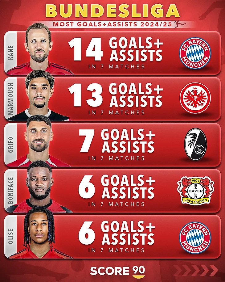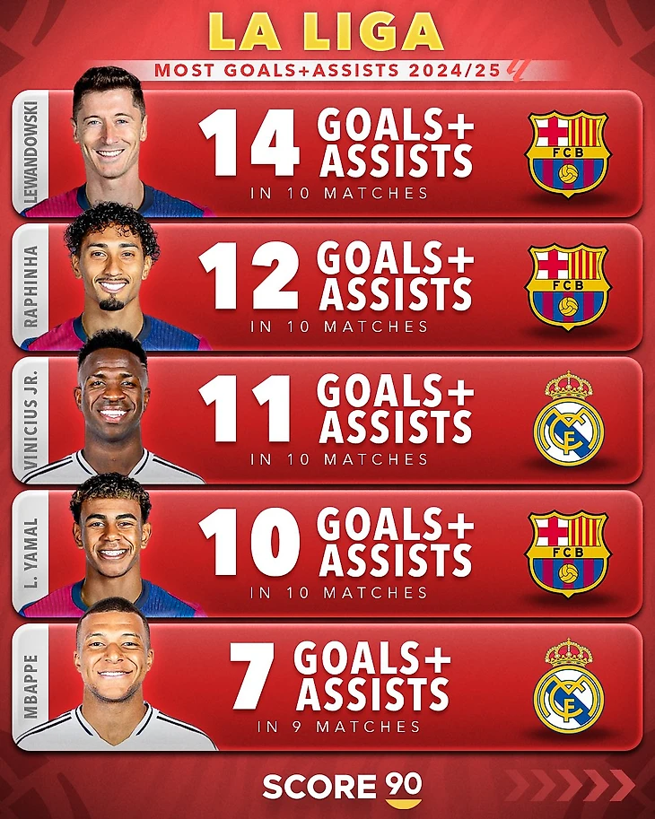 Специализированный портал Score 90 составил рейтинги из пяти лидеров по голам и ассистам в каждой лиге.
