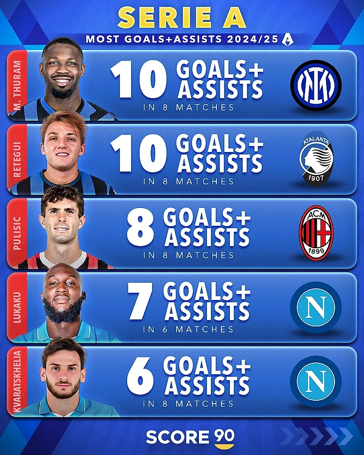 В чемпионате Италии лидирует «Наполи», но лидеры гонки бомбардиров - это игрок «Интера» Маркус Тюрам и представитель «Аталанты» Матео Ретеги.