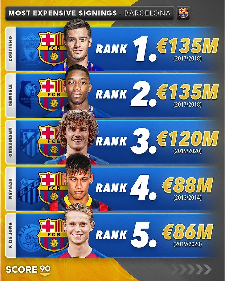 Ситуация у «Барселоны» с дорогими подписаниями неоднозначная. Несмотря на безусловный талант всех пяти игроков, зарекомендовать себя смогли только Неймар и Френки де Йонг, Гризманну, Дембеле и Коутиньо мешали травмы и недоверие тренеров.
