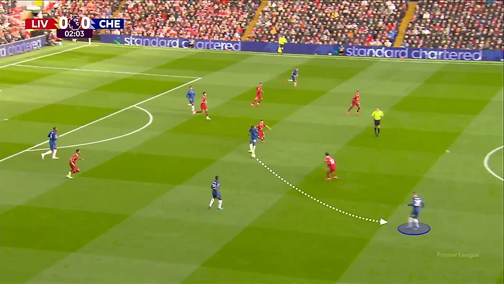 Ситуация, где дополнительный игрок «Челси» оказывался перед или за линией прессинга «Ливерпуля» была не единичной – вот пример с 38-й минуты матча, когда таким игроком оказался Гюсто: