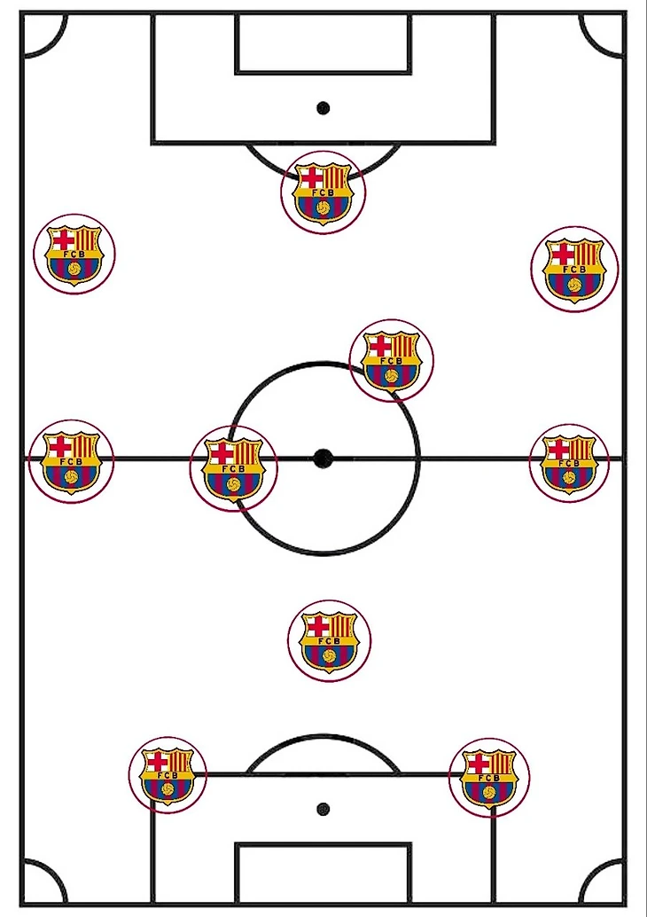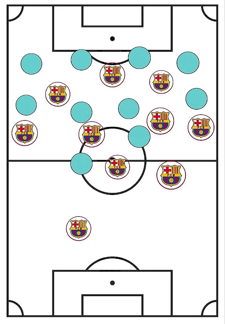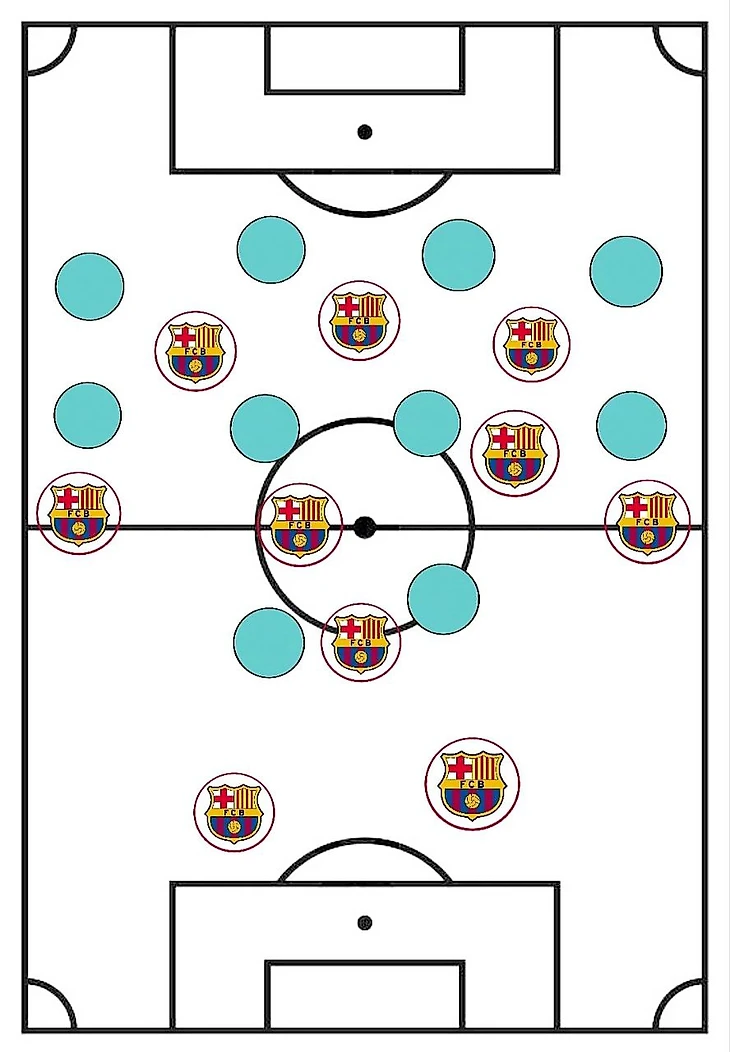 При первичном розыгрыше мяча «Барселона» использует голкипера, как одного из полноценных центральных защитников при владении, что позволяет создать номинальную 3+1, где оба центральных, зачастую Иньиго и Пау, располагаются в широких позициях на границах штрафной площади, Бальде и Кунде поднимаются выше, а в центре образуется асимметричный треугольник с Касадо (ранее Берналем) в качестве единственной 6, Педри в роли гибридной 6/8, поскольку по крайней необходимости испанец опускается ниже, помогая партнерам и Ольмо/Рафиньей, как связующим звеном между атакой и обороной.
