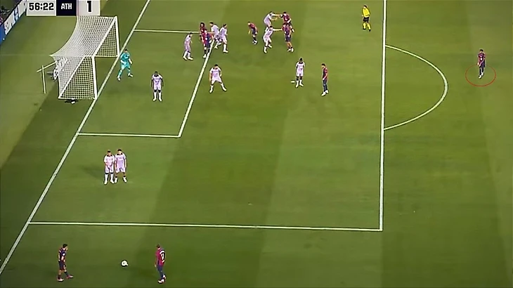 Обратите внимание на этот кадр. Все игроки атакующей группы «Барселоны» находятся в штрафной, кроме одного, стоящего в изоляции. Вы абсолютно верно поняли, это Ламин Ямаль. Но почему?