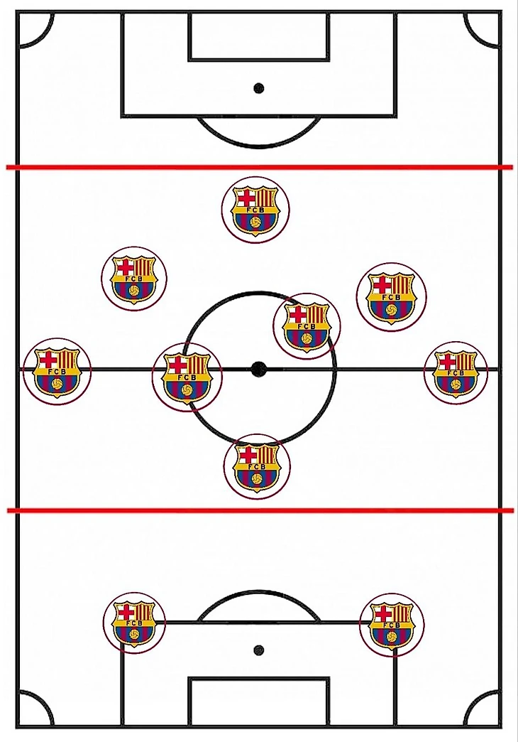 Еще один важный отличительный фактор билд-апа Флика — высота и ширина расположения игроков. Команда Ханси стремится занять максимально возможное пространство. Кунде и Бальде действуют близ бровки, доходя почти до центральной линии уже на этапе начала построения атаки, что отключает для «Барселоны» возможность продвижения через фланги в первой фазе билд-апа, зато открывает дверь целому спектру преимуществ в случае перехода команды во вторую фазу — владению во второй трети поля, которую обычно называют центром. На этом этапе у блауграны появляется численное превосходство, поскольку сразу 8 игроков оказываются в пределах этой зоны. К чему это приводит? Во-первых, у «Барселоны» появляется возможность эффективно вести борьбу за второй мяч, т.е. большинство подборов или спорных эпизодов так или оказываются успешными для команды.