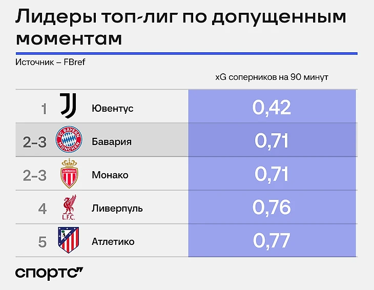 Теперь факт: в топ-лигах только «Ювентус» допускает меньше моментов, чем «Бавария».