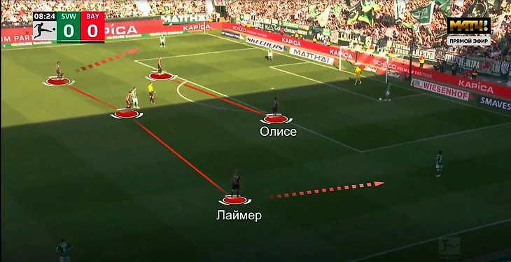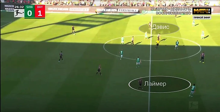Против «Вердера» сложнее: Майкл Олисе (правый вингер) поднимался вторым нападающим к Харри Кейну, Конрад Лаймер (правый защитник) поднимался по флангу.