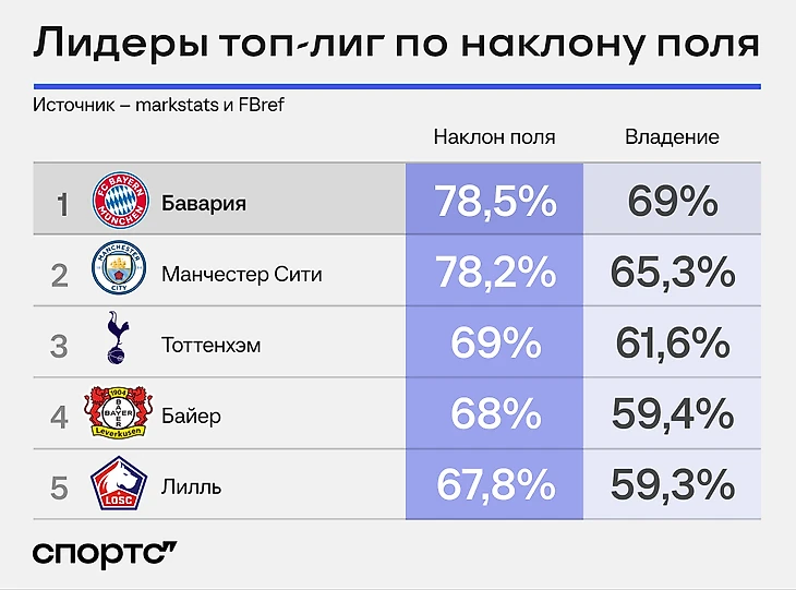 Владение – про контроль над мячом (по владению «Бавария» тоже лидер топ-лиг). Наклон поля говорит о территориальном доминировании.