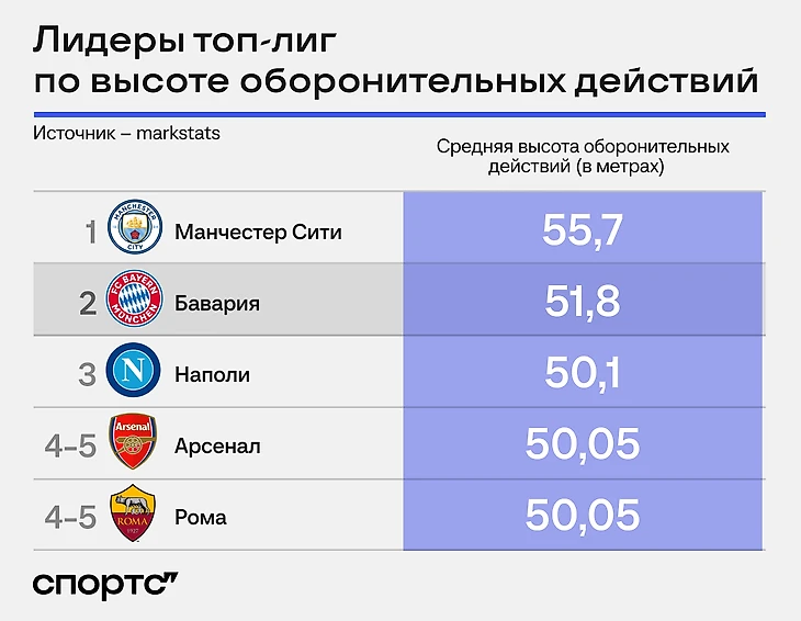 Еще «Бавария» – вторая команда топ-лиг по средней высоте оборонительных действий. Давит и не отступает.