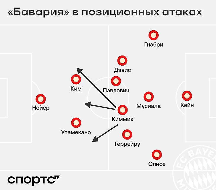 Фундаментальный игрок для позиционной атаки – Йозуа Киммих. Он оказывается или между Кимом и Упамекано, или слева от них, или справа, или над ними. Из-за Киммиха структура розыгрышей регулярно меняется, «Баварию» тяжело прочитать и еще сложнее запрессинговать. Йозуа – главный двигатель мяча.