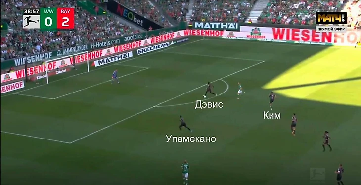 Структура с внушительным насыщением оси очень удобна для контрпрессинга, то есть прессинга сразу после потери мяча. Грандиозную работу проделывают Киммих и Павлович. Дэвис благодаря узкой позиции и уникальной скорости страхует Кима и Упамекано, он стабильно самый быстрый игрок на поле.