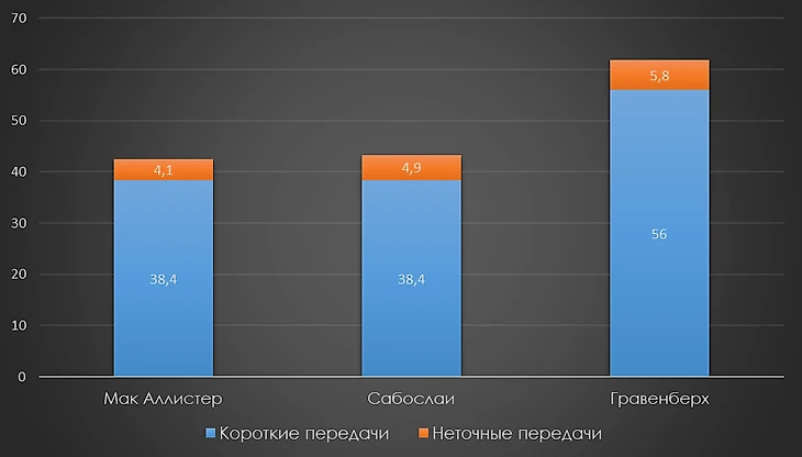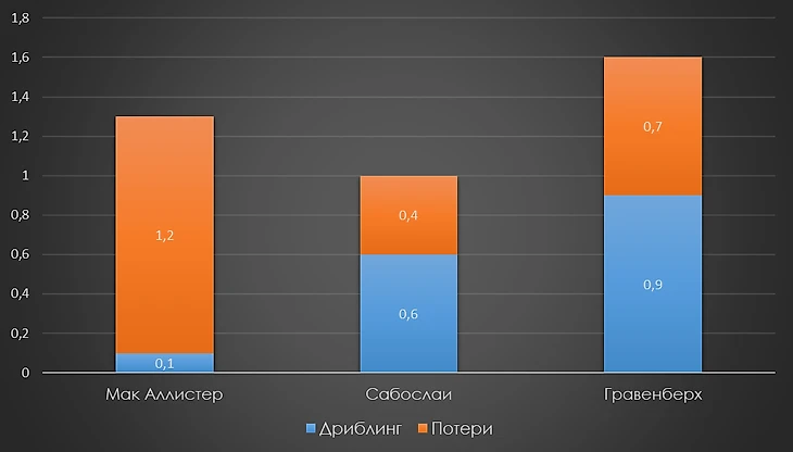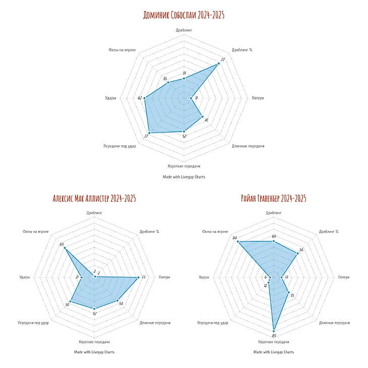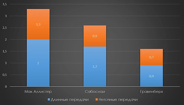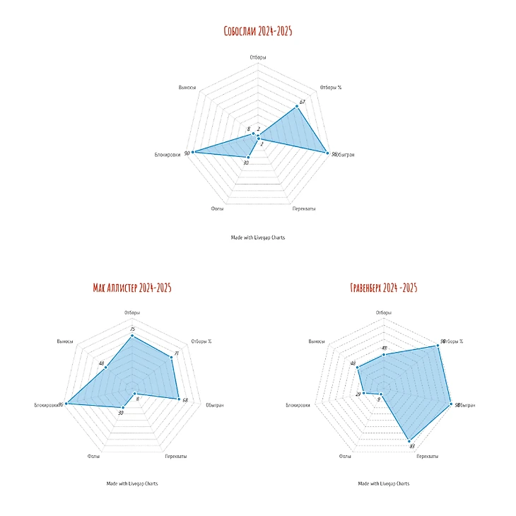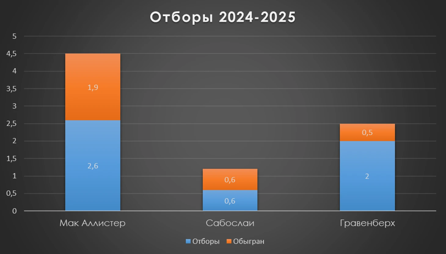 В нынешнем сезоне в тройке Собослаи - Мак Аллистер - Гравенберх, первый действует выше. Гравенберх с Мак Аллистером выполняют роль двух опорных.