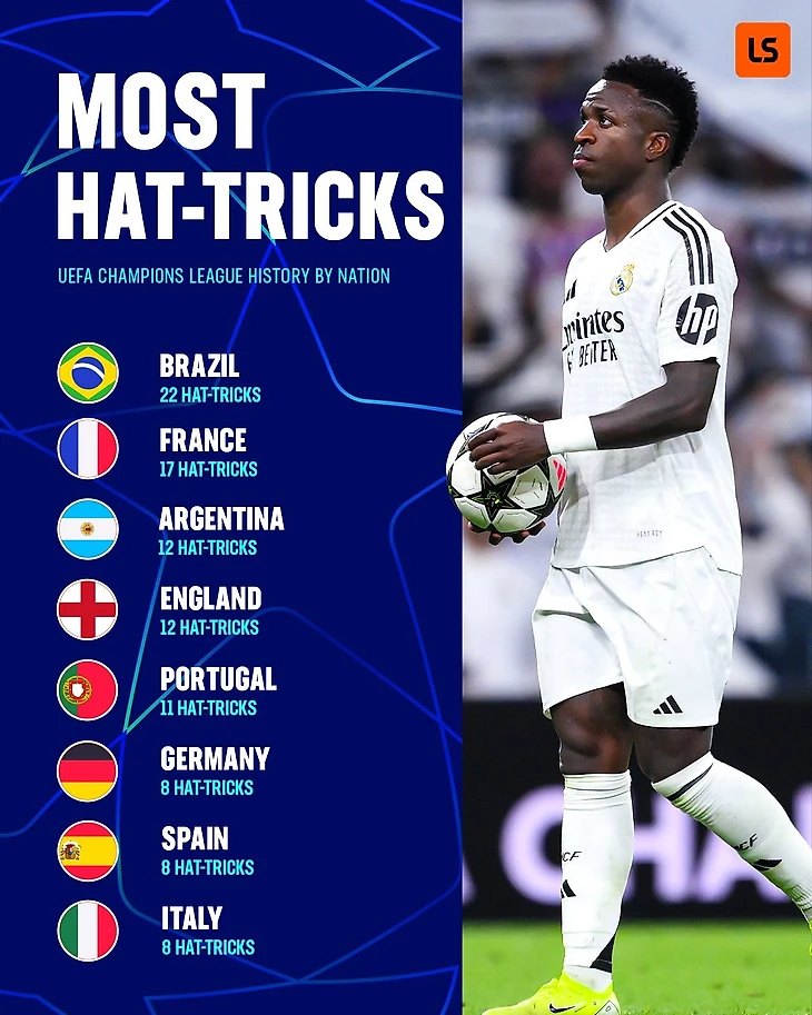 А говорят, Винисиус не тащит Бразилию. Показываем, представители каких стран чаще оформляли хет-трики в ЛЧ