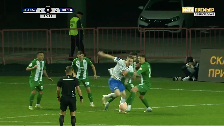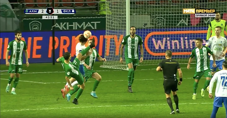Первый – непенальти на Алексее Каштанове, когда он получил удар по ноге в штрафной «Ахмата» на 50‑й минуте матча.