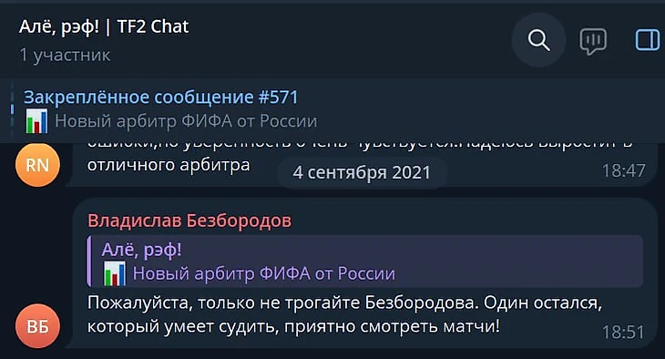 Пользователь с никнеймом «Владислав Безбородов» комментировал посты в телеграм-канале «Але, рэф!»: «Пожалуйста, только не трогайте Безбородова. Один остался, который умеет судить, приятно смотреть матчи».
