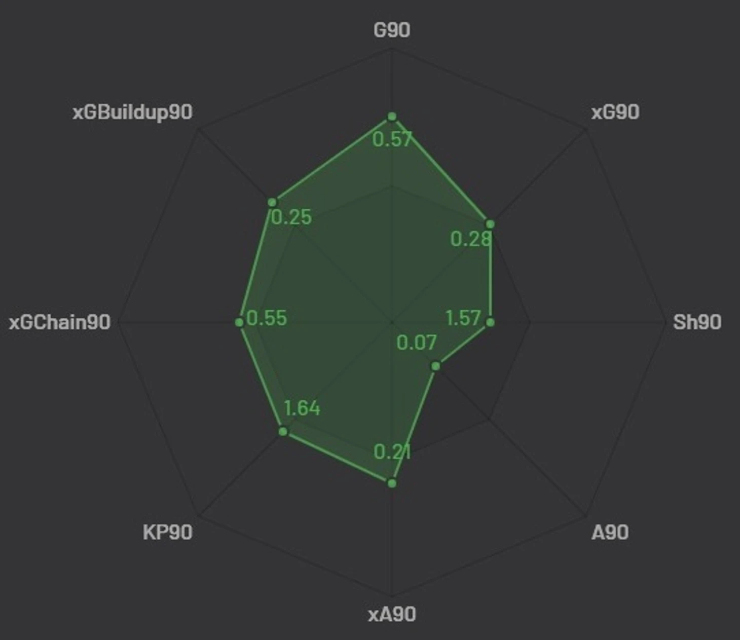 xGBuildUp – тоже самое что xGChain, но исключает получение цифр для двух игроков: бьющего, и отдавшего передачу под удар. Все характеристики взяты с пересчетом на 90 минут.