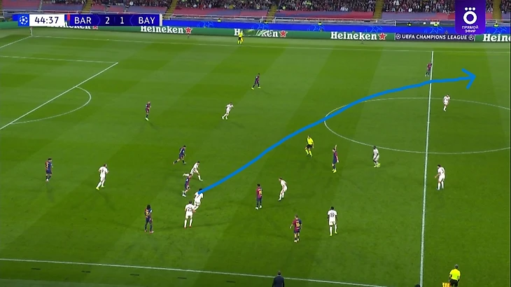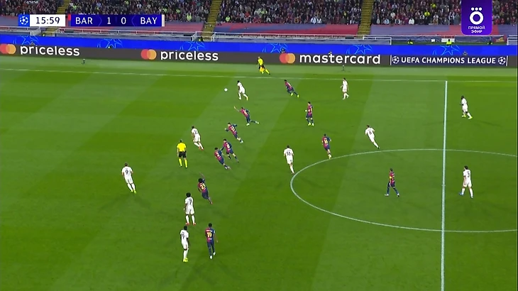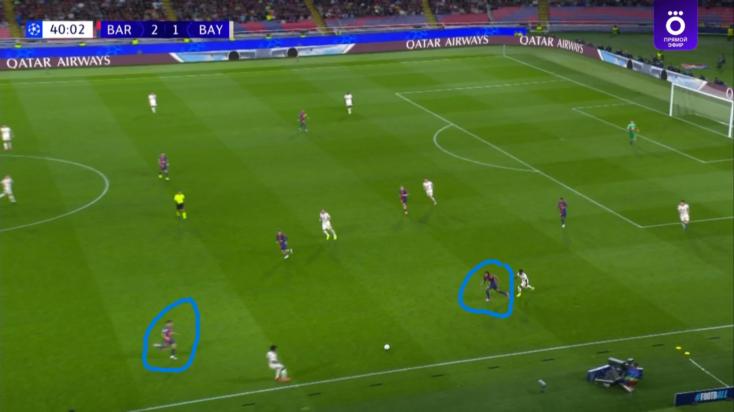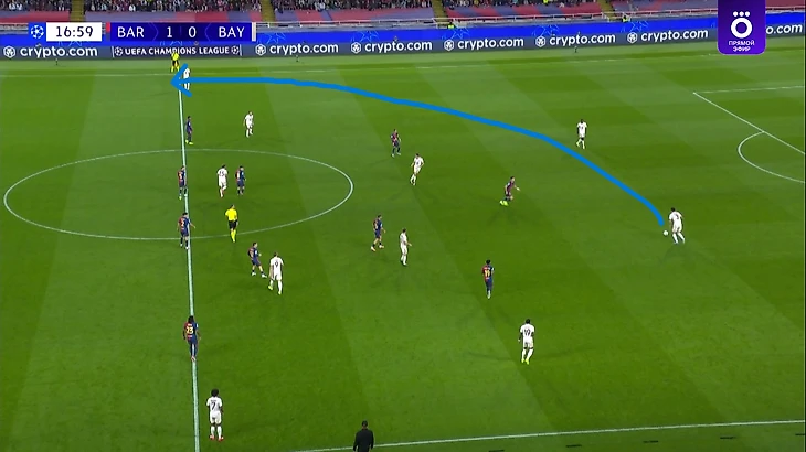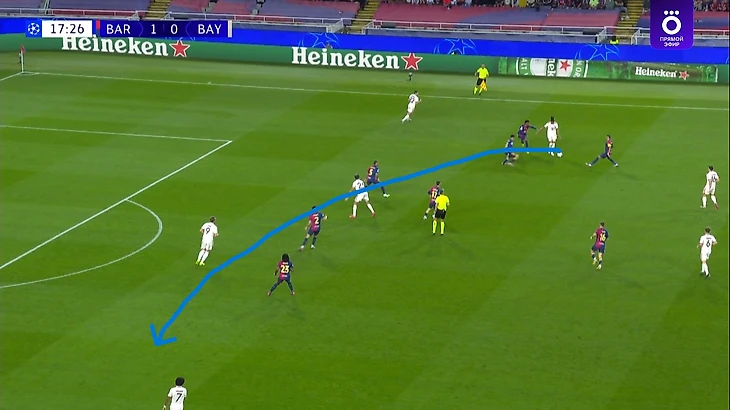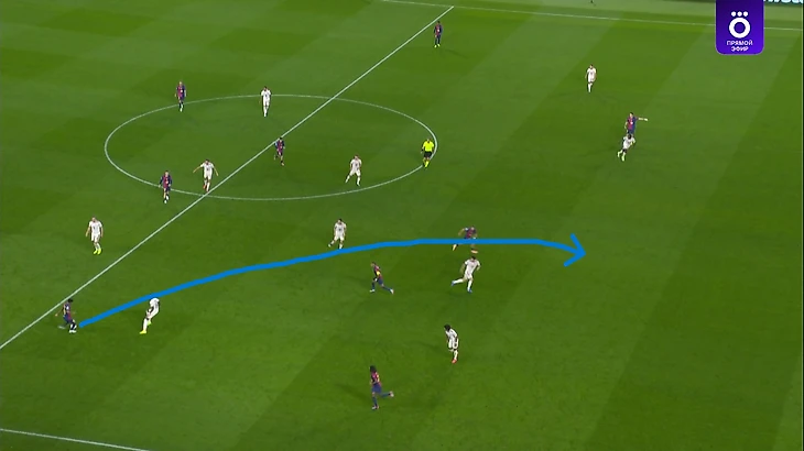 Фермин действительно будто первый человек из команды хозяев, кто решил сделать вертикальный рывок. Дальше он подтолкнет Кима, отдаст на Левандовского и сделает первый гол. Потом, через несколько минут, Барселона делает уже первый свой диагональный перевод. Пас идет на Рафинью.