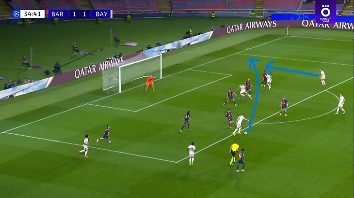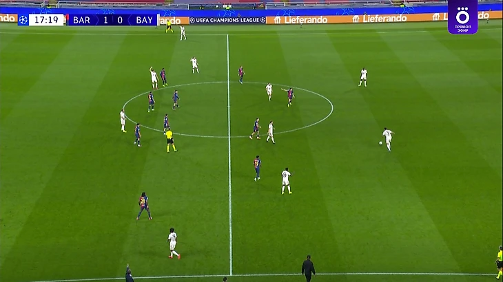 Иногда это доходило до абсурдного, как на скрине выше, но все еще работало. И продолжило работать бы до конца матча, если бы Бавария не перешла на диагонали. Мое почтение, Ханси Флик.