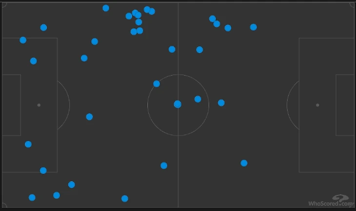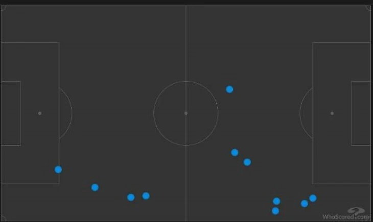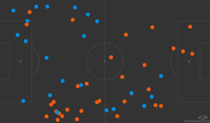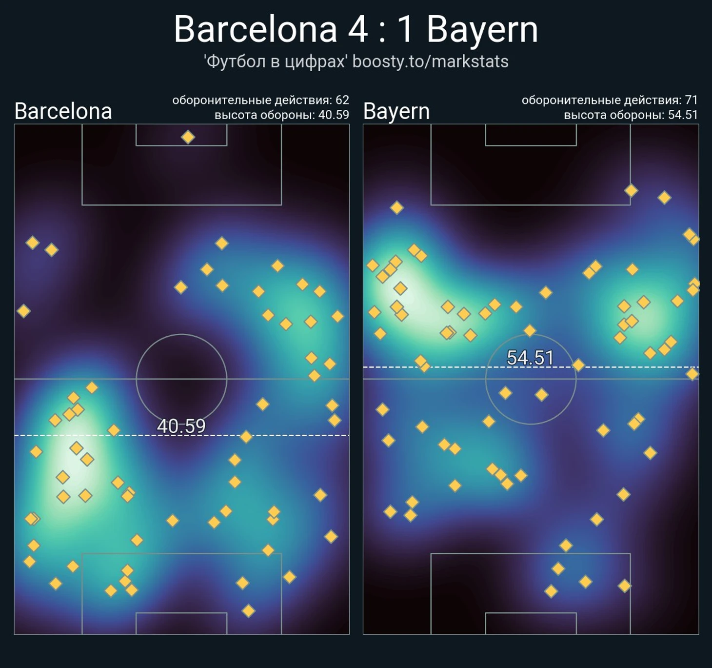 Тут все очень просто: Бавария неимоверно душила прессингом и заставляла выбивать, а Барселона невероятно ловила соперников в офсайдные ловушки. Мюнхенцы набрали всего 5,8 PPDA (один из лучших показателей по прессингу в сезоне (тут чем меньше, тем лучше). По итогу, заставляли Пенью выбивать и организовали ему всего 74% точности передач. Хозяева, кстати, тоже не промах были в прессинге.