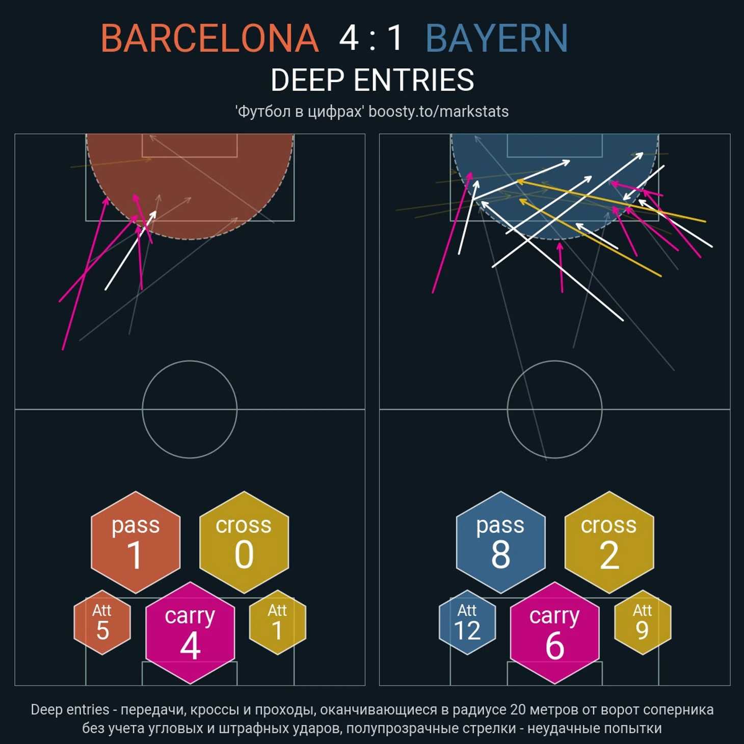 Очень важно отметить громадную деталь: игрой то владела Бавария. Да, счет разгромный, да в конце все было для гостей плохо, но до 65-й минуты преимущество было у немцев. Владение 64% на 36%, подходов больше, ударов больше, опасности больше. Да, Барселона очень круто оборонялась и выигрывала по праву, но преимущества у нее не было. Вот даже посмотрите на проникновения в опасную зону.