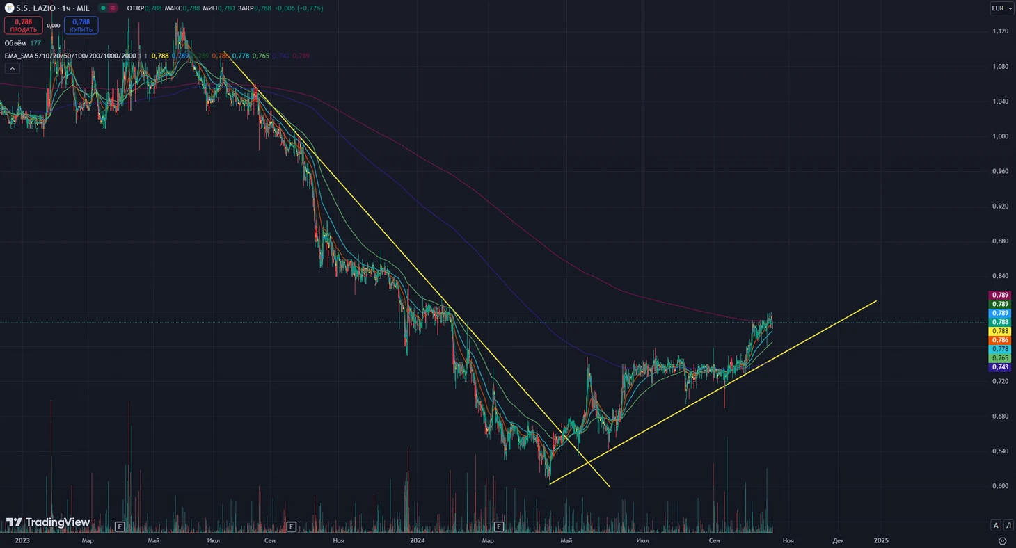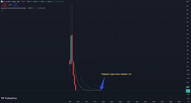 Отвесное падение началось в 2000 году, а уже в 2001 году концерн Cirio, спонсировавший «Лацио», был объявлен банкротом. В момент выхода акций они стоили 277 евро. а теперь торгуются по 0,788. Комментарии излишни.