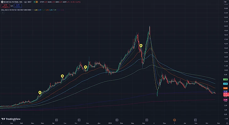 Жёлтыми маркерами на графике указано когда ЦБ Турции значительно повышал ставку. Обратите внимание, что акции клуба всё равно идут вниз, в отличие от индекса турецкой биржи. Не завидую тем, кто заходил в акцию на одном из пиков цены.