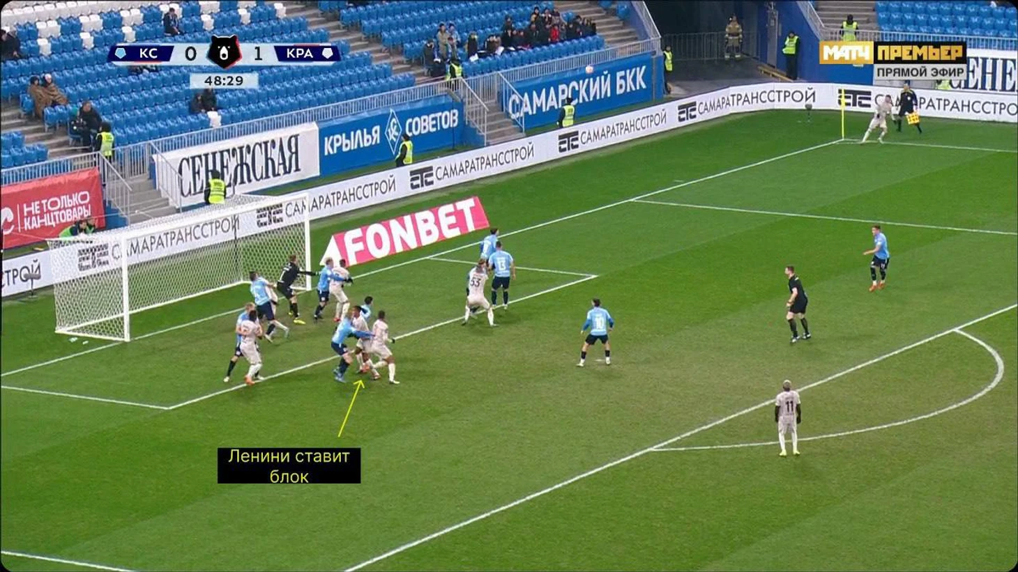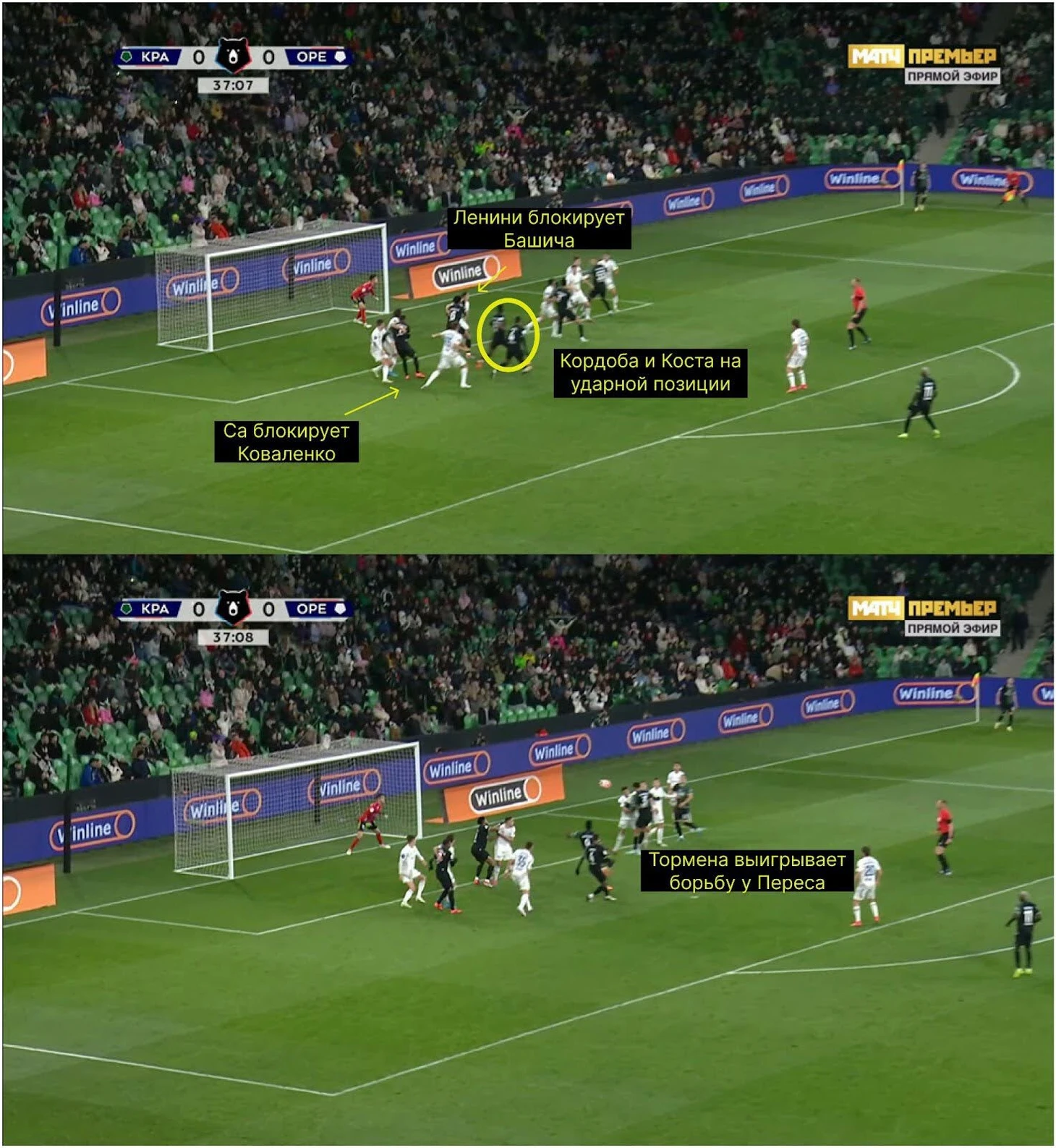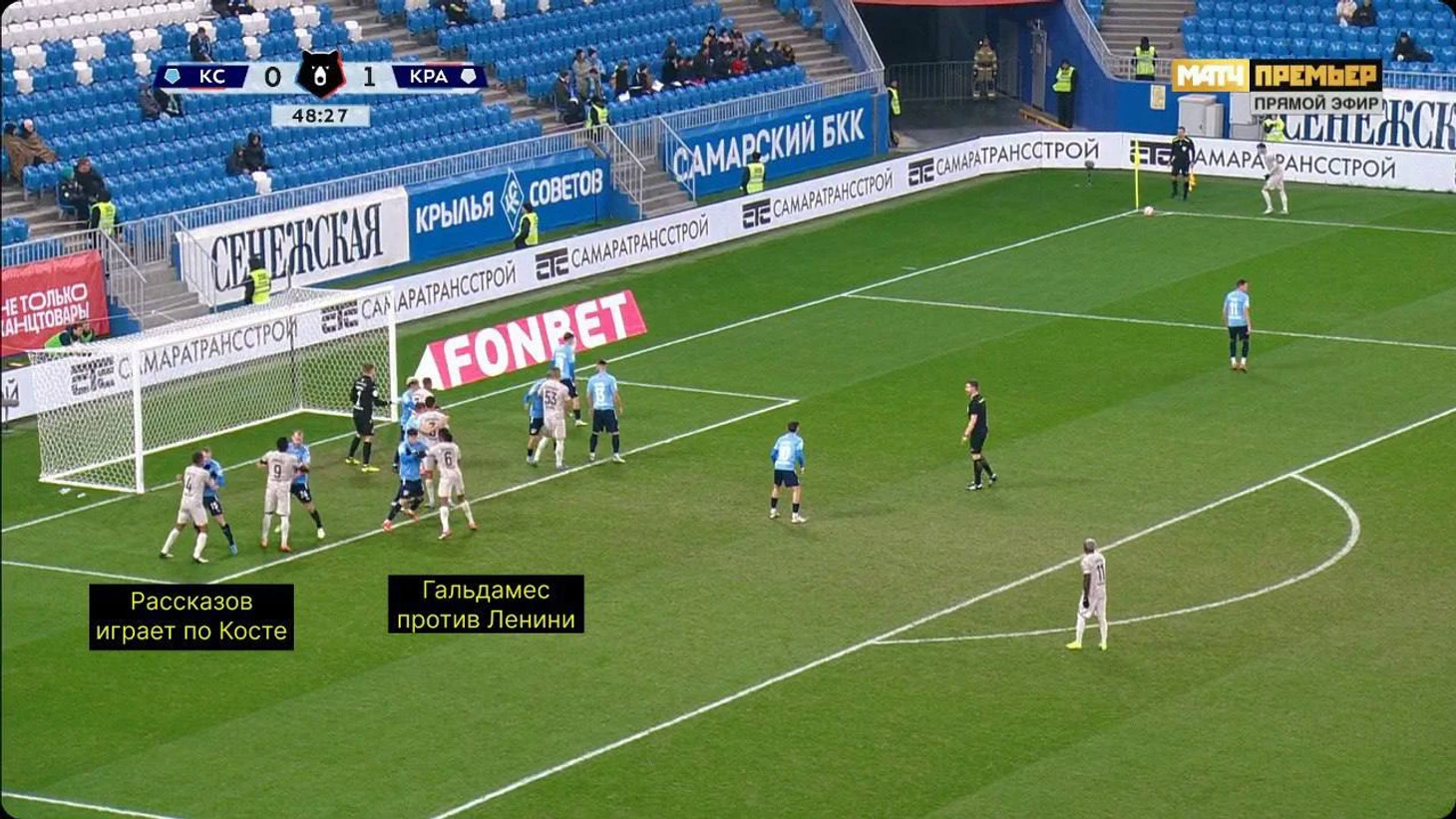 Ленини и Са – теневые герои эпизода: заблокировали Коваленко и Башича и расчистили пространство перед вратарской для партнеров. Скорее всего, по аналогии с розыгрышем против «КС» завершать должен был кто-то из пары Кордоба – Коста, но Тормена выиграл борьбу на ближнем углу, а Ленини классно доработал и забил победный.