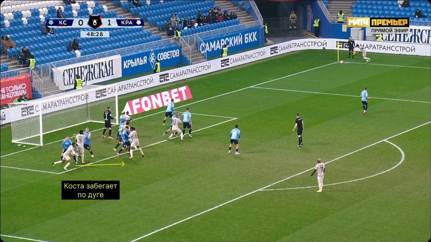 Похожий образом забили «Оренбургу», только в этот раз с дальней штанги атаковали уже два игрока: Коста и Кордоба.