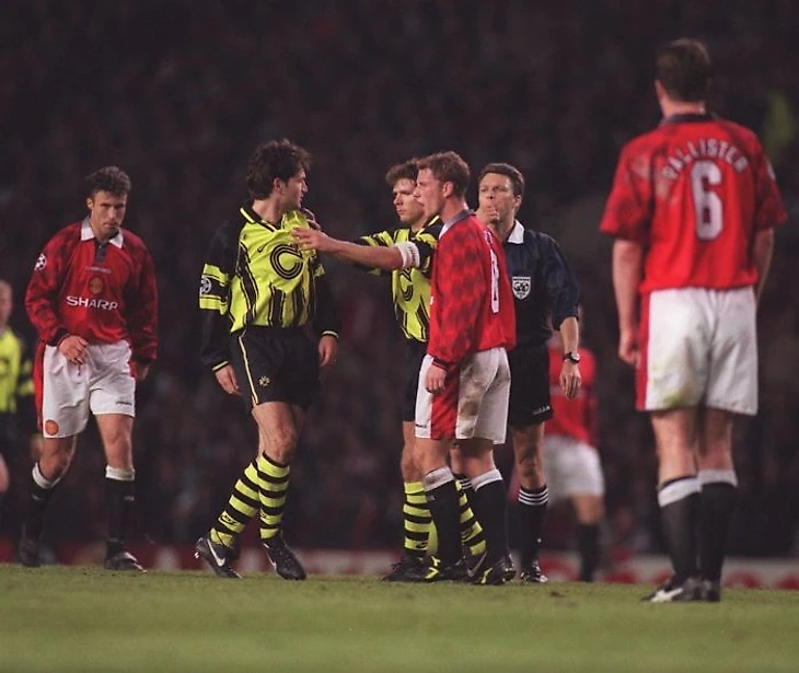 В полуфинале «Боруссии» достался «Манчестер Юнайтед» Алекса Фергюсона со звёздным составом: Невилл и Ирвин на флангах защиты, Бекхэм и Гиггз над ними полузащите, суровый Рой Кин и креативный Пол Скоулз в центре поля, Сульшер на острие, а капитанил тогда Эрик Кантона. Первый матч проходил в Дортмунде, соперники играли на равных, исход поединка решил удар Рене Тречока из-за штрафной. 1:0 победа «шмелей». Ответный матч проходил на стадионе «Олд Траффорд, «Боруссия» смогла повести в счёте уже на 7 минуте усилиями Ларса Риккена. «Манчестер Юнайтед» имел преимущество походу всего матча и должен был забивать несколько раз, однако счёт остался неизменным. «Боруссия» выходит в финал