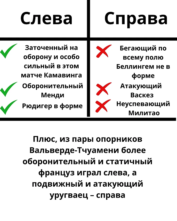 Таким образом, выпустив Ольмо Флик, возможно, сам того не зная, обеспечил победу. Когда начали создаваться моменты, то там и перевес в сторону ворот Пеньи ушел, а так вполне могли пропускать и не один: Модрич прекрасно вошел в игру, Мбаппе не успокаивался, Винисиус без дела не сидел – шансы были. А вообще, создается впечатление, что Реалу правый фланг не нужен: они и атакуют слева, и защищаются лучше там же. Словно наследие Криштиану живет и притягивает все прекрасное к себе. Хотя нет, Вальверде, Карвахаля и неплохого Лукаса же не притянуло – они «право» спасают.