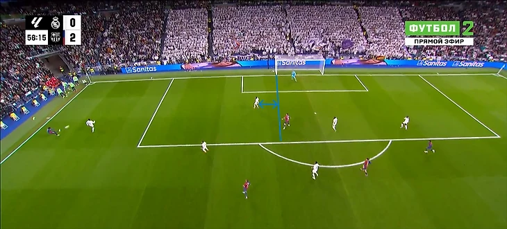 Посмотрите, где Ольмо разворачивает Милитао, и где находятся в это время полузащитники. Огромные дыры у Реала, при которых просто нельзя допускать себя обыгрывать – это последняя надежда на отсутствие голевого момента. Последняя надежда не оправдалась. Так продолжалось до конца матча. Конкретно в этой зоне, конкретно при этих действующих лицах. Основная причина заключается в том, что даже при условном ромбе, центр Реала не справлялся. Причем, в первую очередь, из-за численного недостатка: Камавинга и Беллингем не успевали и покрывать крайних защитников, и садиться центральнее. Милитао в частности и оборону в целом сильно нагрузили, а они не справились.