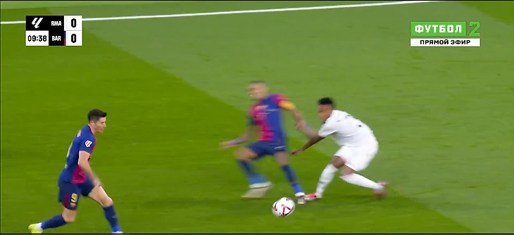 Кирилл Хаит написал, что в первом голе виноват Мбаппе, которого Касадо обыграл в центре поля. Это, конечно, во многом правда, но пропущенного мяча точно можно было избежать даже после недоработки француза. Ошиблась почти вся команда, но выделяем Милитао и Васкеза. Они просто не разобрались между Левандовским и Рафиньей, когда бразилец сместился ниже и центральнее – в зону между линий.