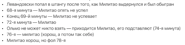 Это удачное совпадение естественного поведения игрока и слабости определенной зоны соперника дало результат. Даже не просто результат, а издевательство над Эдером. Часть моих заметок по матчу с момента появления Ольмо на поле выглядит так: