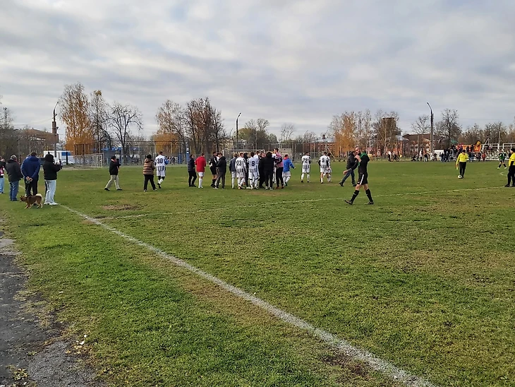 Игроки покровской команды отправляются к сектору активных болельщиков, чтобы разделить с ними радость от второго подряд областного чемпионства. Остальные болельщики «Ники» тоже присоединяются к празднованию и выходят на поле, несмотря на табличку около поля «выход на поле запрещен».
