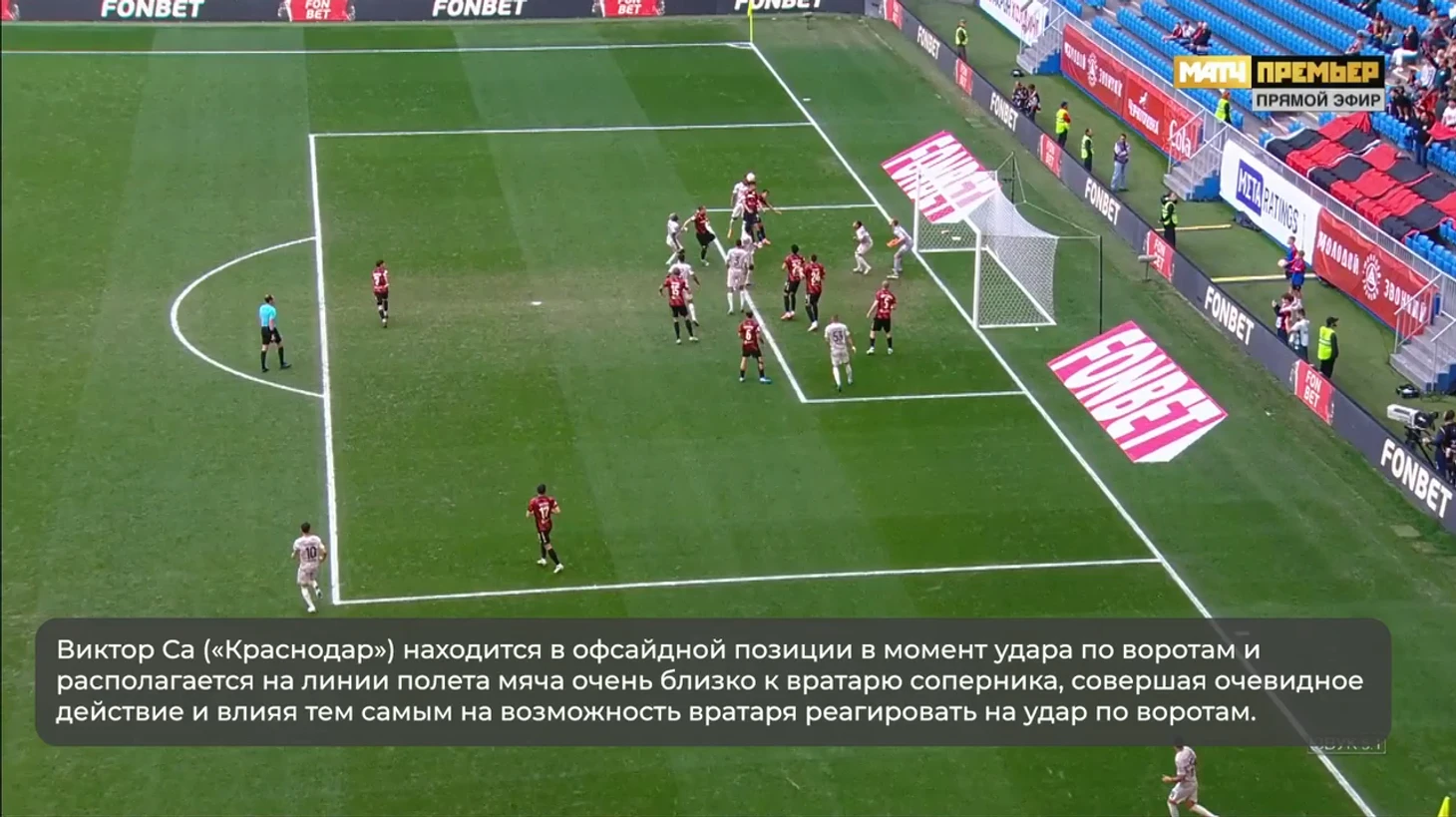 Решение ЭСК мотивировано тем, что игрок атакующей команды «Краснодар» №7 Виктор Са, находящийся в офсайдной позиции в момент удара по воротам его партнером по команде №9 Джоном Кордобой, располагался на линии полета мяча очень близко к вратарю соперника, совершая очевидное действие, и влияя тем самым на возможность вратаря реагировать на полет мяча в направлении ворот.