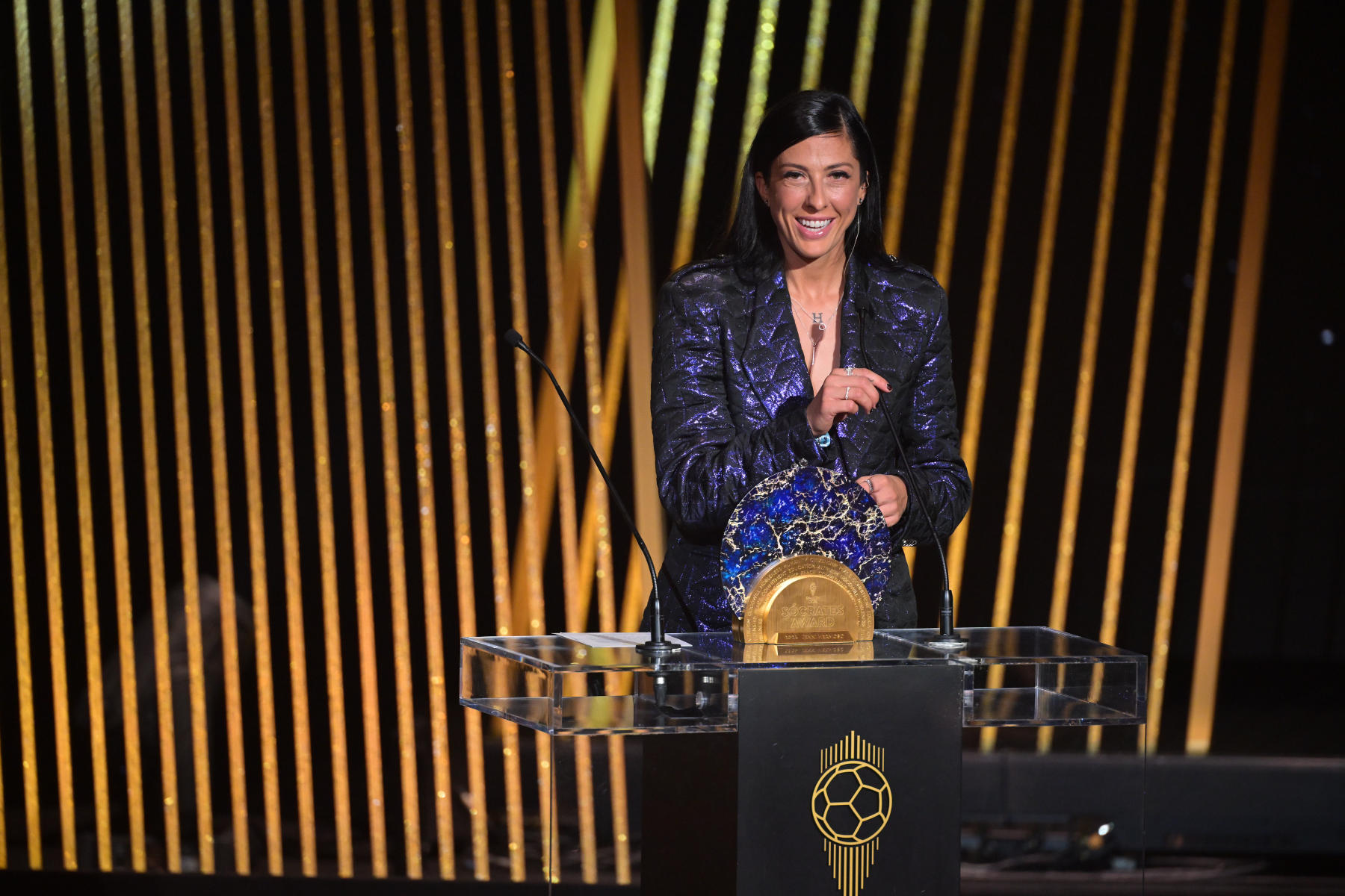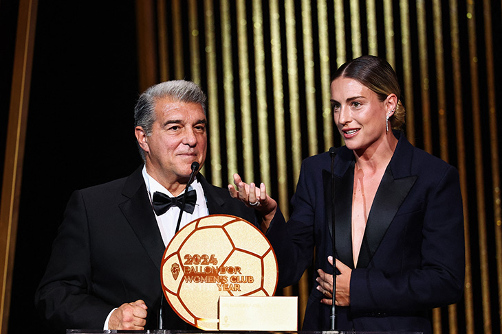 Алексия Путельяс брала «Золотые мячи» в 2021-м и 2022-м – она все еще в десятке претенденток, но на сцену вышла с Жоаном Лапортой получать награду за всю «Барселону» – лучшей команде сезона в мире.