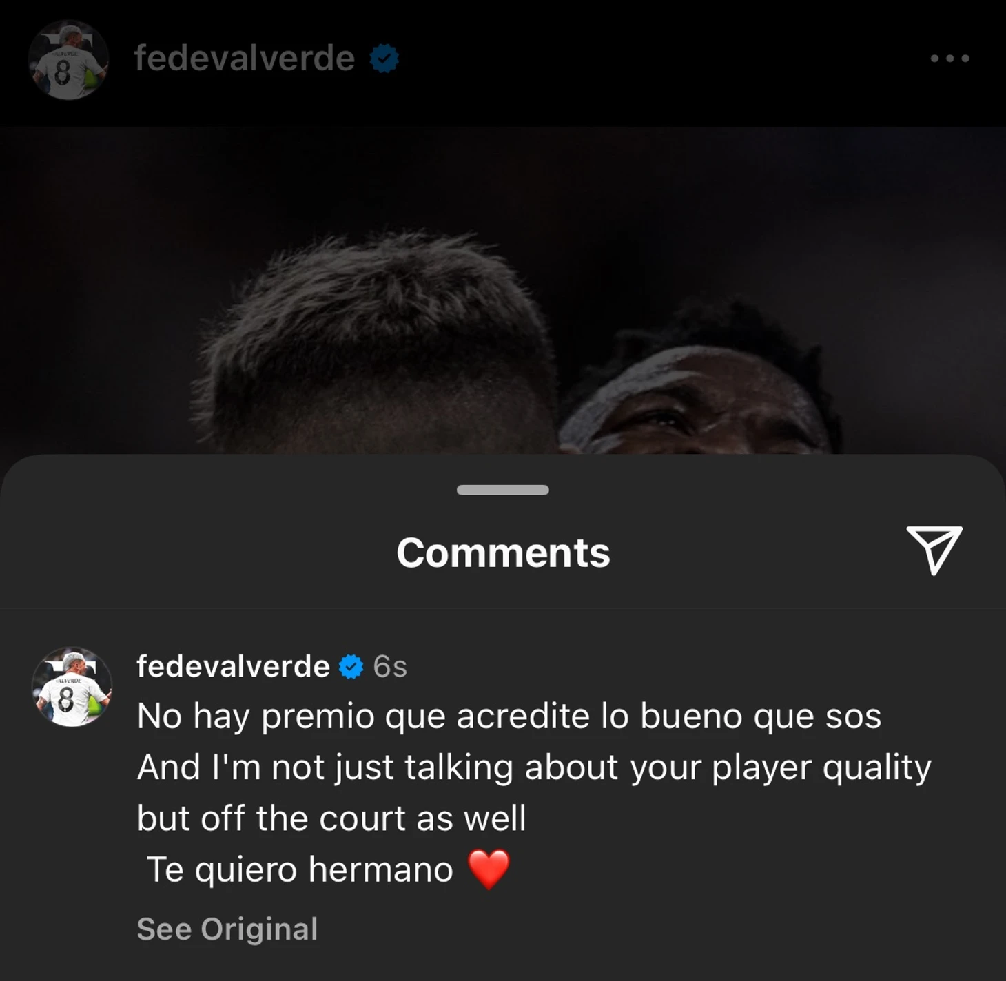 Феде Вальверде: «Ни одна награда не может выразить, насколько ты хорош. И я говорю не только о твоем футбольном мастерстве, но и о том, каков ты за пределами поля. Люблю тебя, брат».