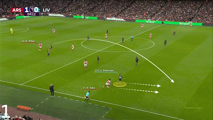 Он снова оказался на земле на «Эмирейтс». Почувствовав, что длинный заброс за спину неминуем, Робертсон начал опускаться, но остальные игроки задней линии «Ливерпуля» этого не сделали. При этом он оставил Сака перед линией мяча и тот опередил его, пробил и забил — ван Дейк не успел прикрыть его.