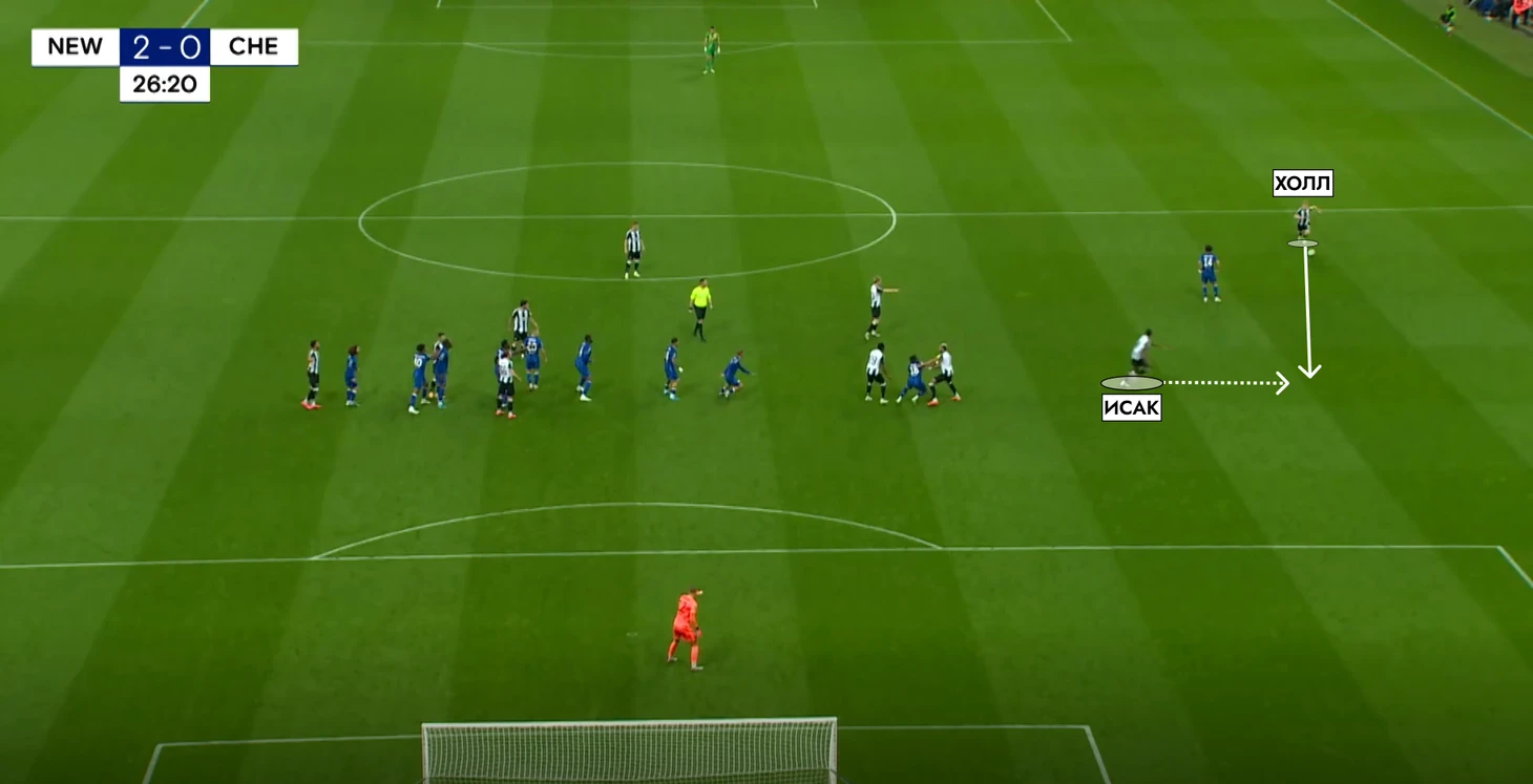 «Сороки» продолжают гнуть свою линию с персональным высоким прессингом. Немного отличалась структура – если в прошлом матче, при розыгрыше от ворот «Челси», прессинговал лишь один Исак, то на сей раз компанию шведу составил Жоэлинтон.