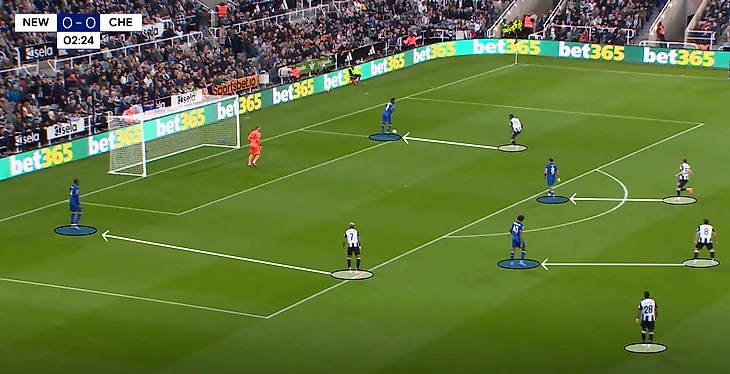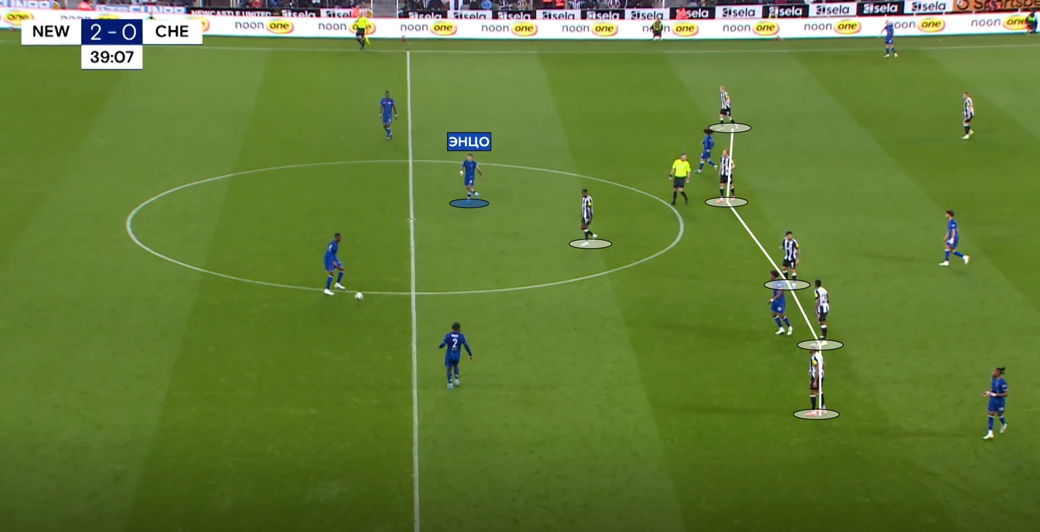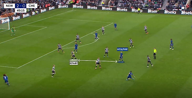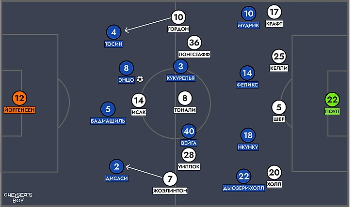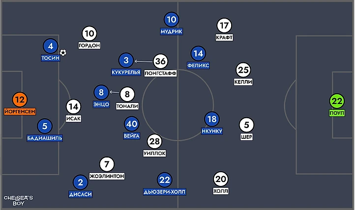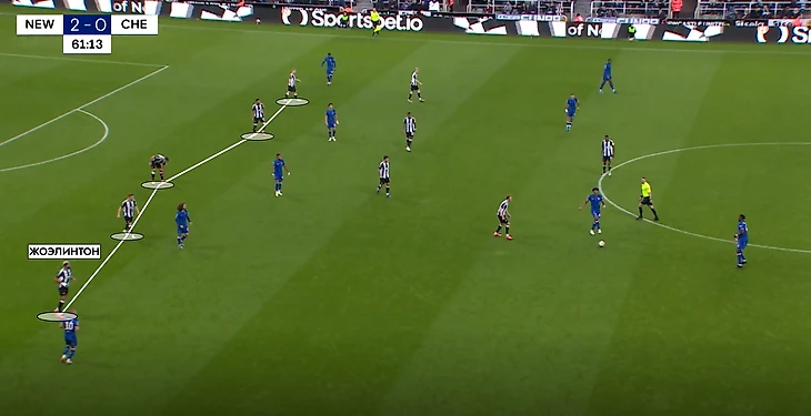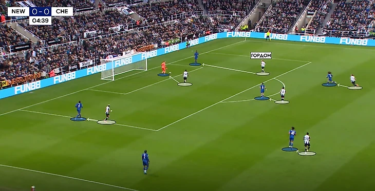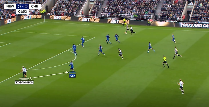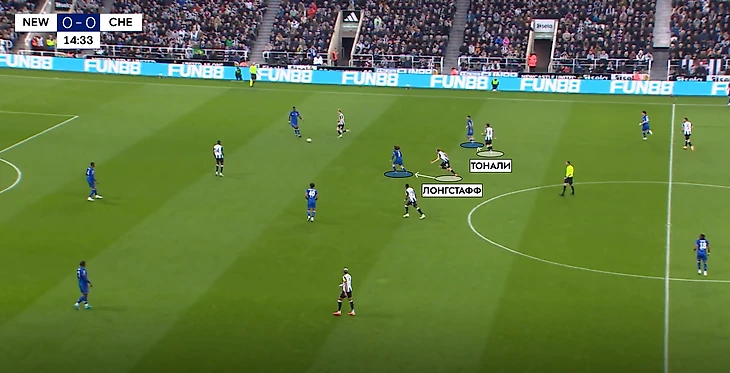 Особое внимание «Ньюкасл» оказывал на Энцо и Кукурелью. Против аргентинца выступил Сандро Тонали – итальянец мешал опорнику «Челси» свободно принимать мяч и участвовать в розыгрышах. В свою очередь, Шон Лонгстафф пытался реагировать на постоянные смещения Кукурельи по центральному каналу.