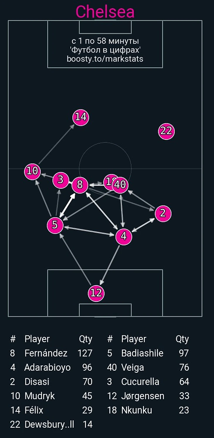 КДХ и Бадьяшиль не уровень серьёзного клуба АПЛ. Феликс - единал и бьёт из любых позиций (несколько ситуаций, где он убого бил вместо того, чтоб катануть на свободного Нкунку) + сами его удары просто ужасны. Вейга с Энцо принципиально не двигают мяч вперёд, из-за чего тому же Нкунку регулярно приходится спускаться чуть ли не в опорку.