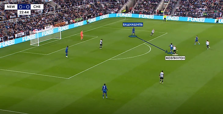И как это часто случается – «Ньюкасл» нашел выгоду благодаря высокому прессингу. Бадиашиль отдает рискованную передачу в борьбу на Вейгу, которого в моменте «съедает» Жоэлинтон.