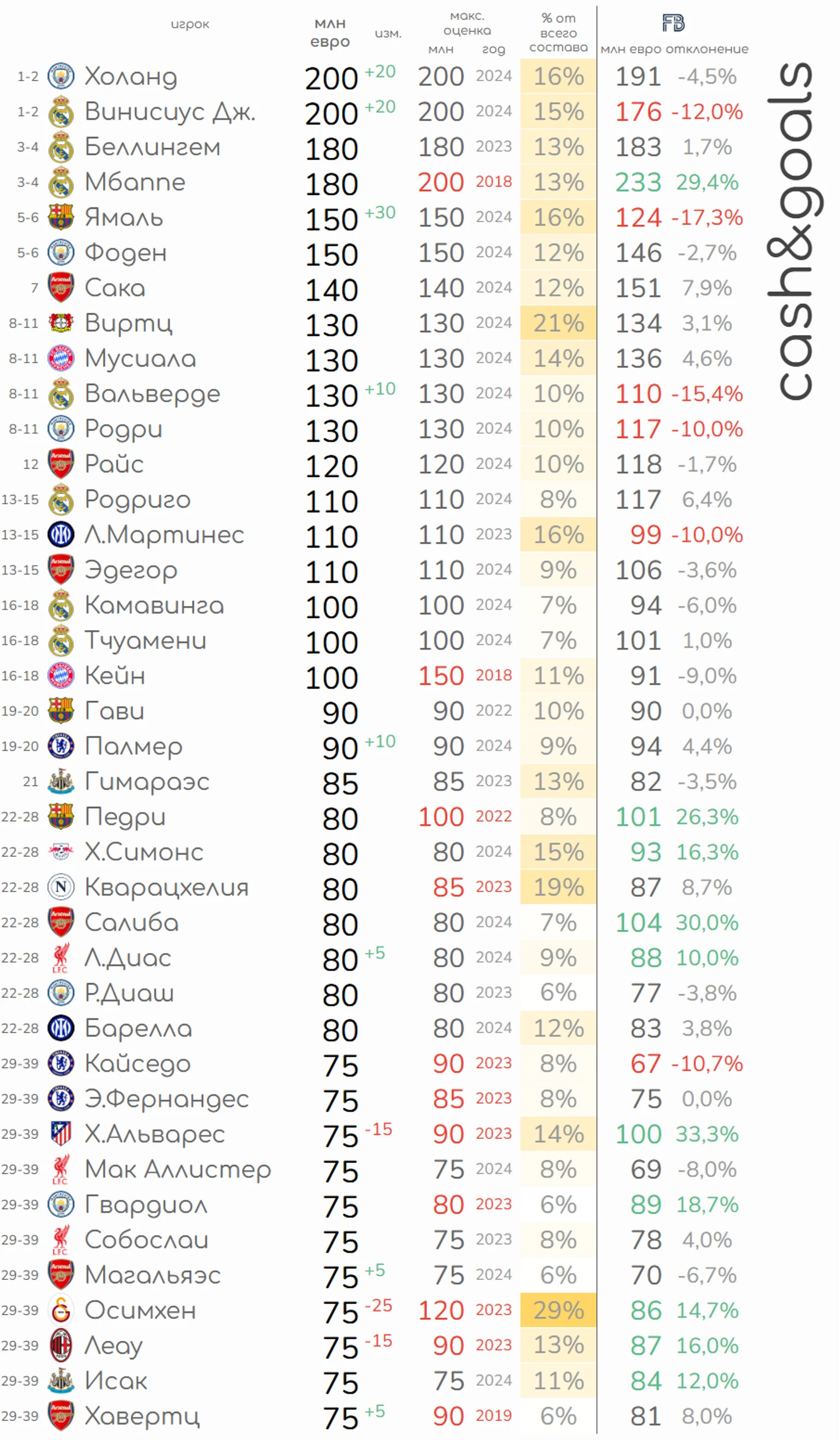 В правых столбцах представлено сравнение с оценкой FB. Ключевое различие - другой лидер! Если по оценке ТМ Килиан Мбаппе уже не дотягивает до максимальных 200 млн евро и с оценкой 180 млн делит третью позицию с напарником по Реалу Джудом Беллингемом, FB оценивает возможный трансфер француза в рекордные 233 млн евро. На 42 млн евро дешевле оценен Эрлинг Холанд (191 млн), на третьей позиции Джуд Беллингем (183 млн, что очень близко к ТМ). Винисиус в рейтинге FB только четвертый. Но что в обоих рейтингах неизменно, так этот состав топ4 - золотая тройка Реала (Винисиус-Беллингем-Мбаппе) + Холанд.