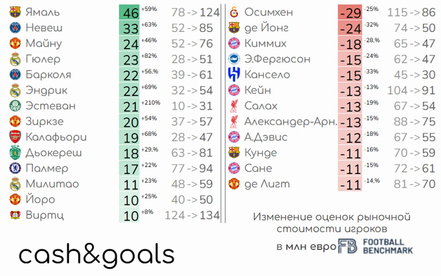 Ламин Ямаль возглавил топ растущих ценников с прибавкой в 30 млн евро. В списке вообще много игроков Барселоны (наибольшее представительство, 6 игроков), что и не удивительно. Ямаль, Фермин, Касадо и Кубарси молоды (Ямаль и Кубарси вообще подростки), показывают отличные результаты и в любой логике оценок должны расти в стоимости. Рафинья и Кунде прямо сейчас показывают отличные результаты, их подорожание тоже неудивительно.