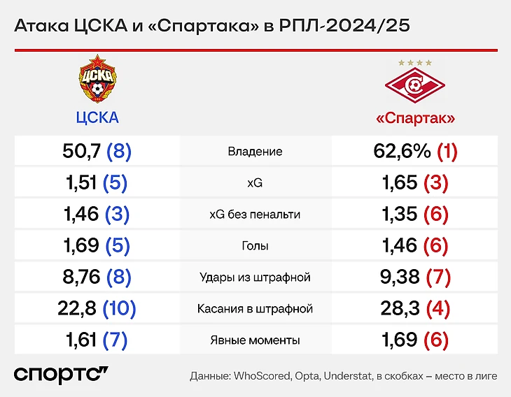 «Спартак» – самая контролирующая команда РПЛ, но тормозящая на чужой половине. На третьем месте по ожидаемым голам, хотя без учета пенальти «Спартак» выпадает из топ-5.